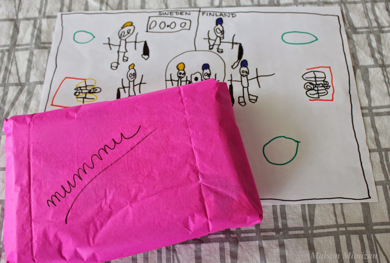 Valmis työ kääräistiin silkkipaperiin. Poika piirsi vielä mummulle jääkiekkoaiheisen äitienpäiväkuvan.