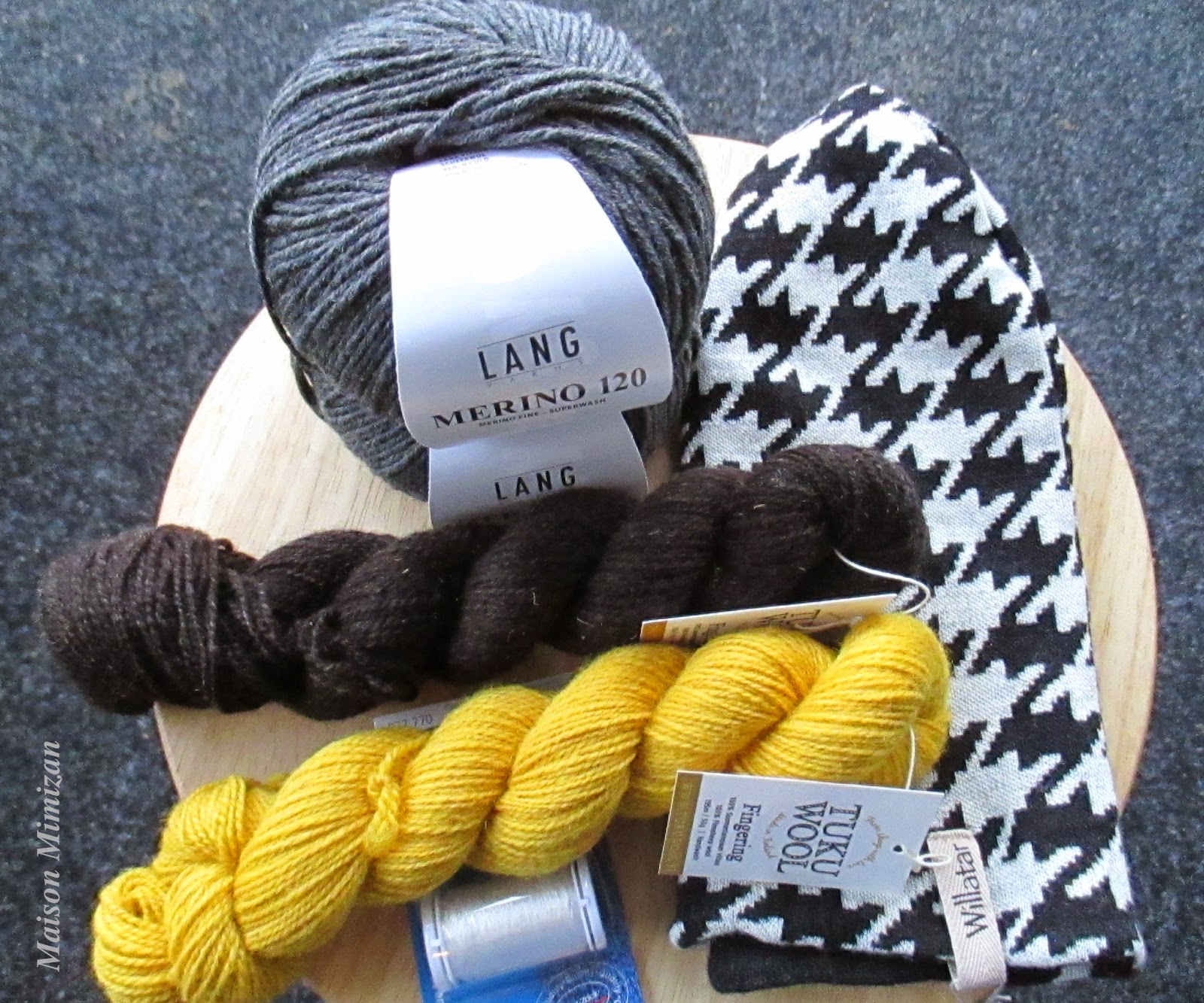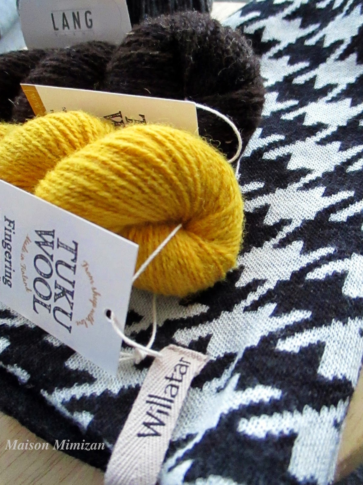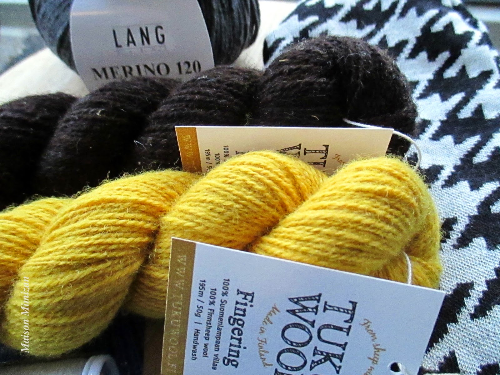 Tukuwoolilta löysin ihania villalankoja. Nämä ovat suomenlampaasta ja villa kehrätään ja värjätään myös Suomessa. Tumman ruskea lanka on luonnonvärinen ja toinen kerä on sinapinkeltainen (kuvassa ainakin minun näytöllä näyttää ihan peruskeltaiselta). Näistä kahdesta vyyhdistä pitäisi riittää esimerkiksi kahteen pipoon.